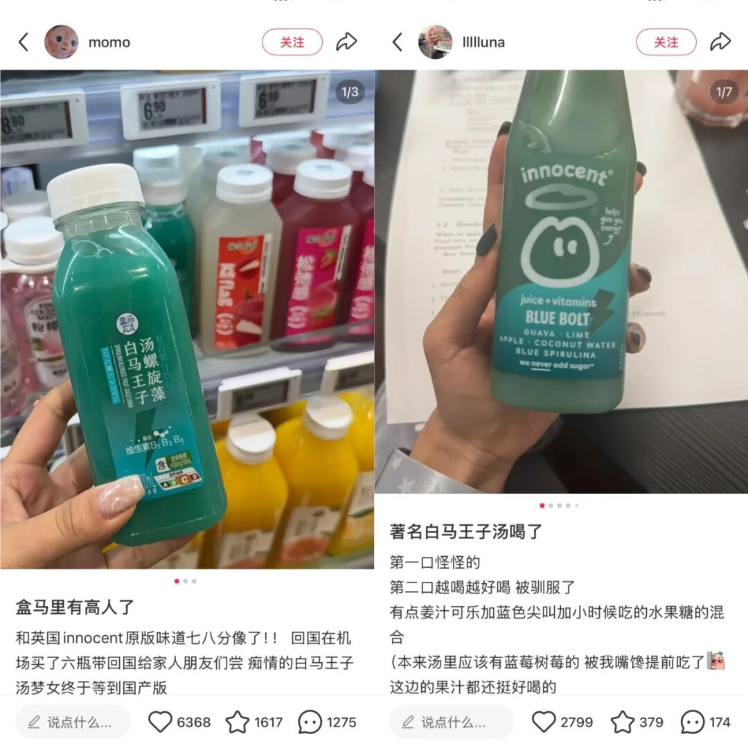 有网友指出,盒马的这款“白马王子汤螺旋藻”,味道与英国健康果汁品牌innocent推出的螺旋藻果蔬汁有七八分相似,可以作为回国后的“平替”。